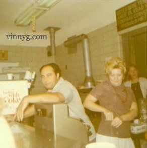My Dad wiping the counter, I was sneaking into the photo. Notice the tap beer handles in front of me, the walk-in box cooler was right behind them.